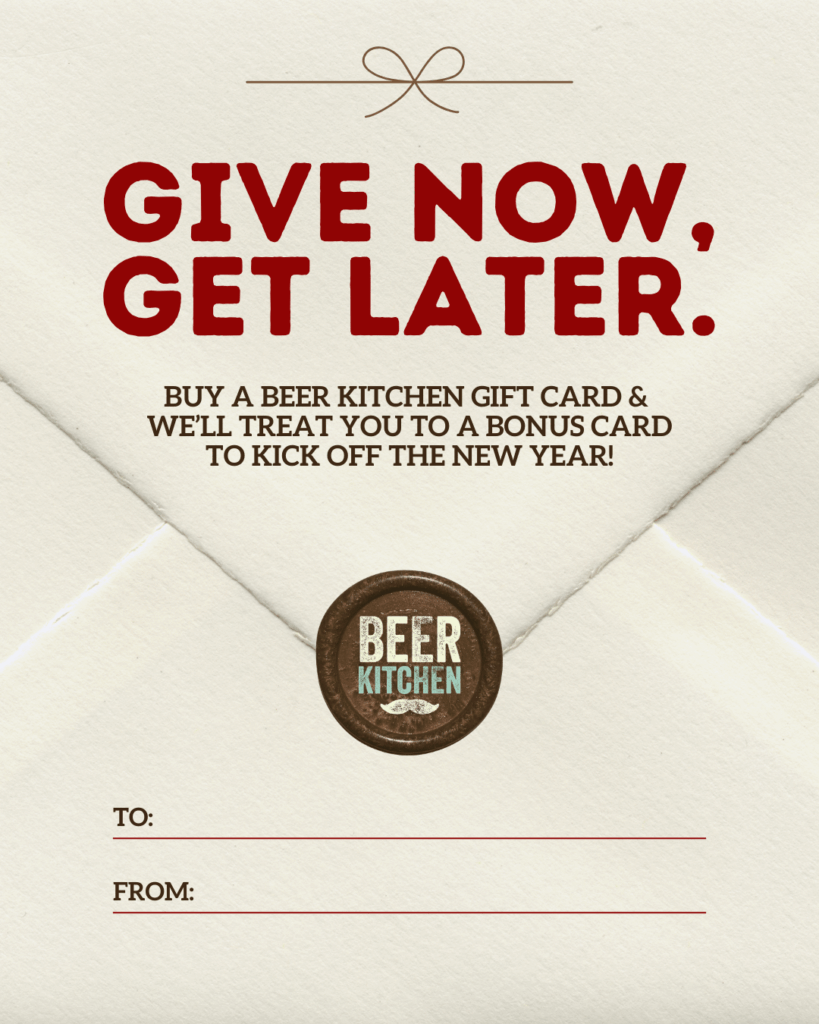 A Beer Kitchen gift card is the perfect gift for anyone in your life who loves great beer, great food, and great fun. They’re redeemable at any Culinary Virtue concept throughout the Kansas City metro area and can be purchased at our location in historic Westport.